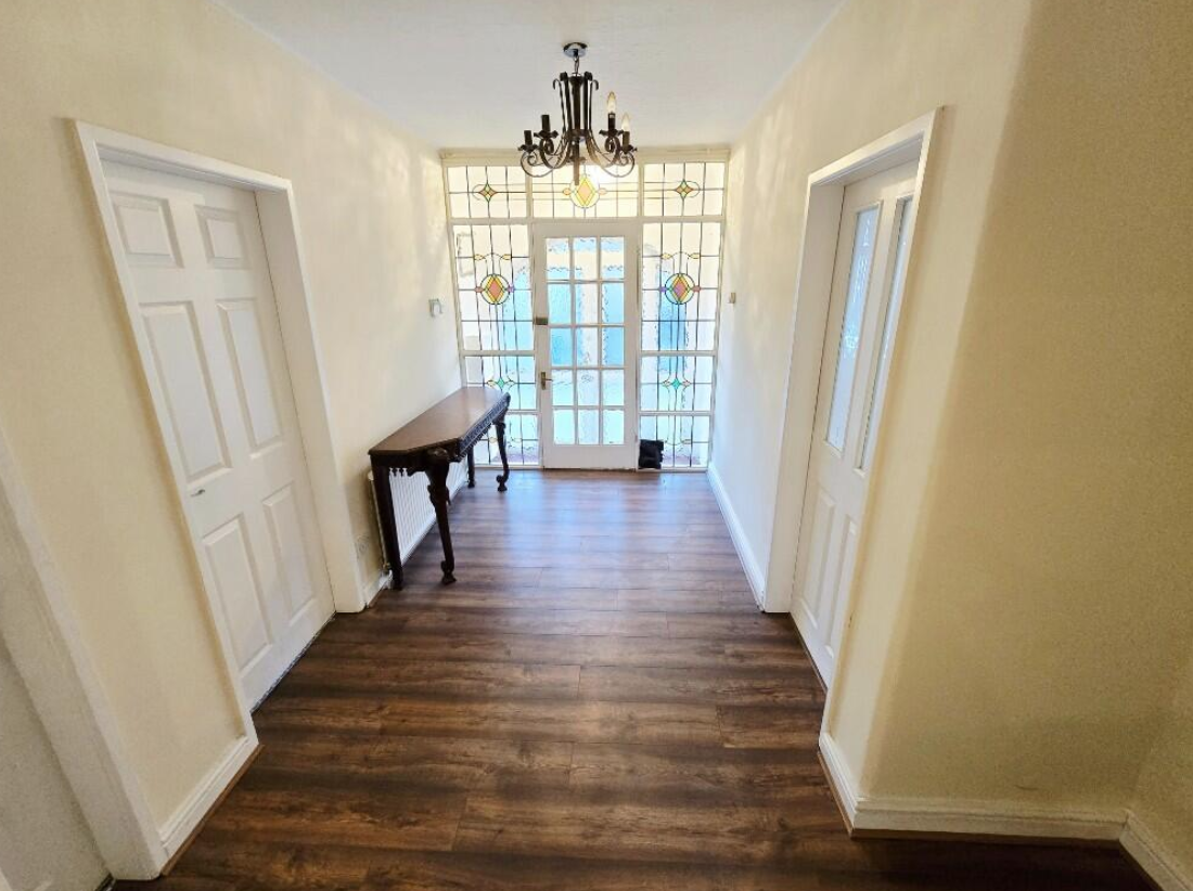 On entering the property, you are welcomed by a beautiful hallway featuring charming stained-glass windows.
