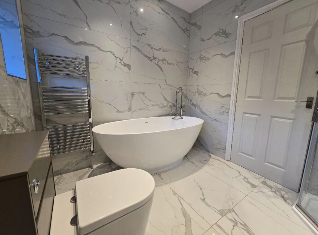The bathroom has been newly fitted, showcasing a luxurious freestanding bath and a separate shower cubicle.