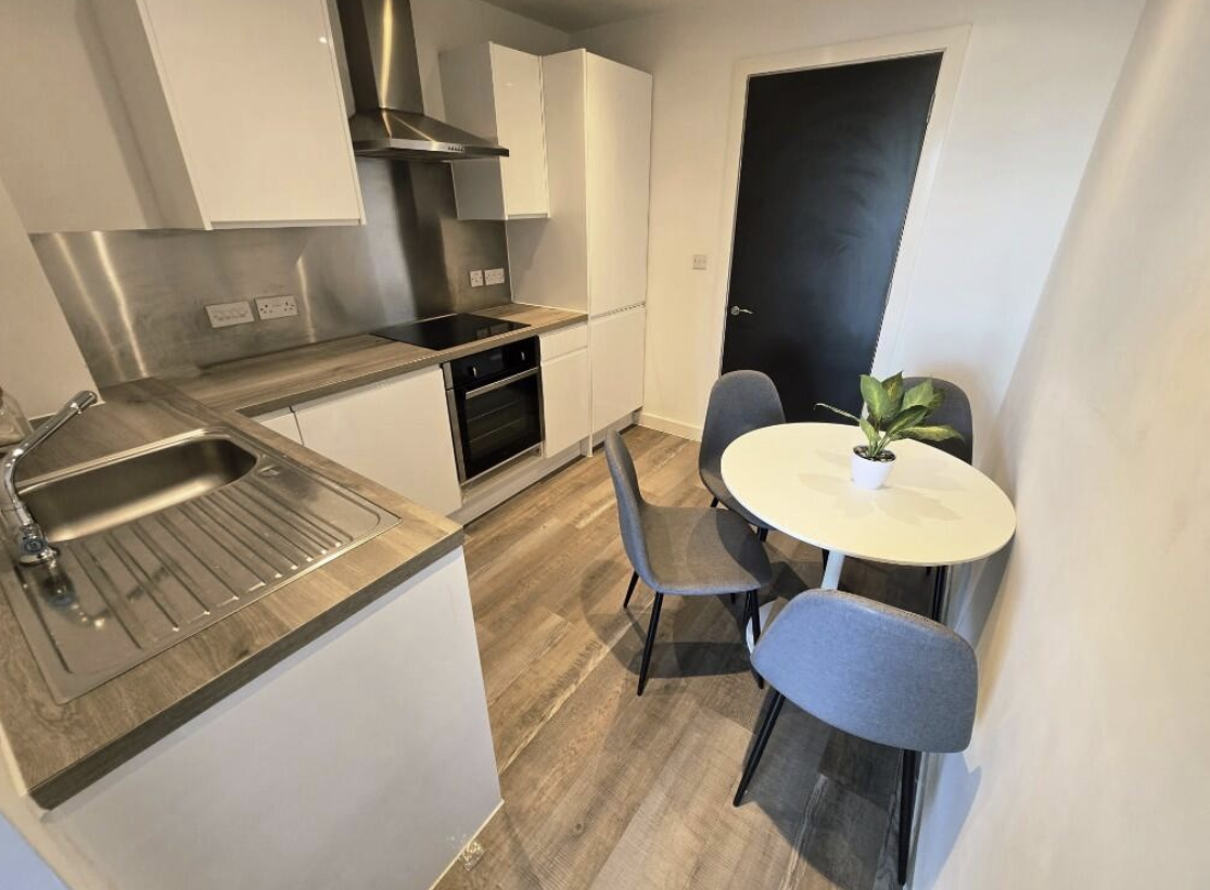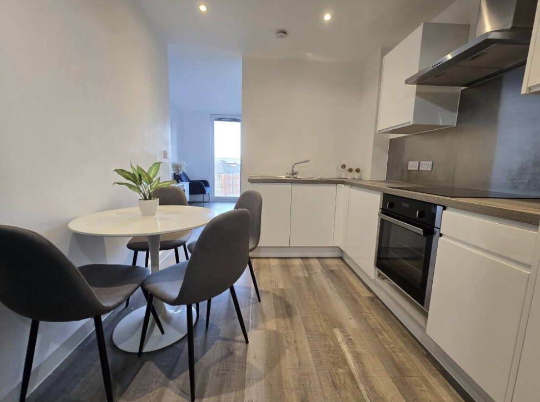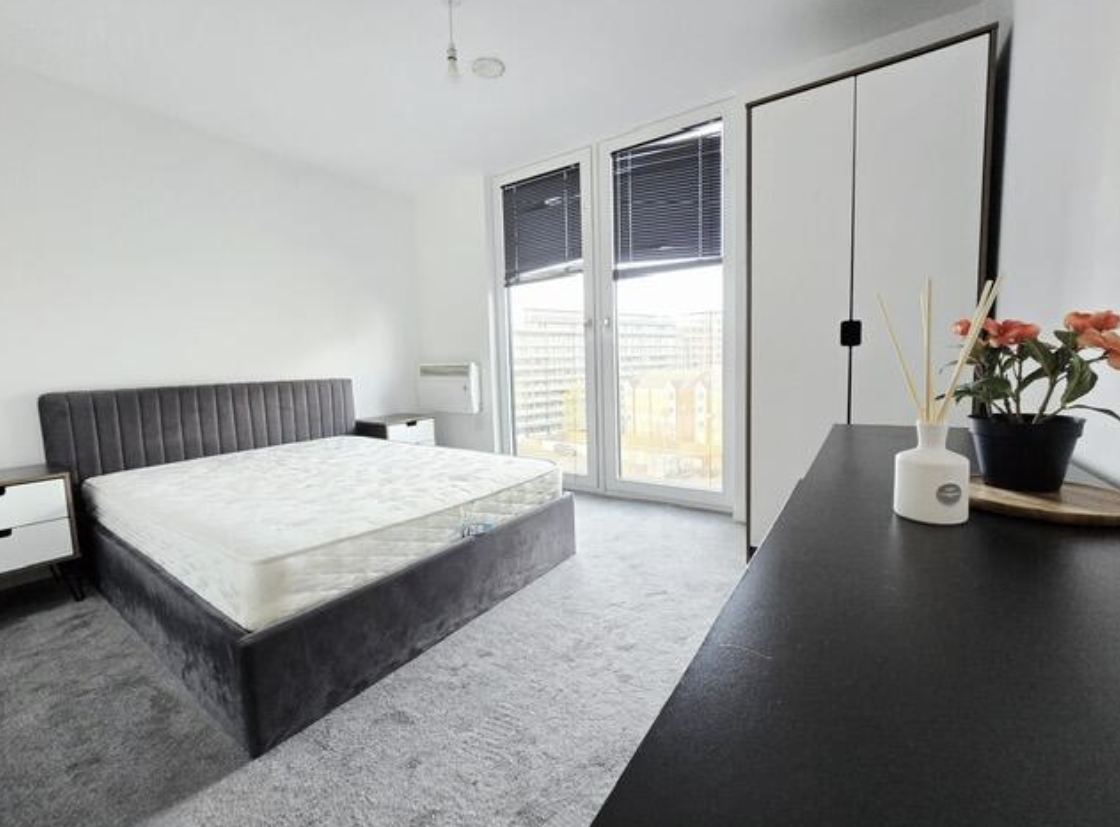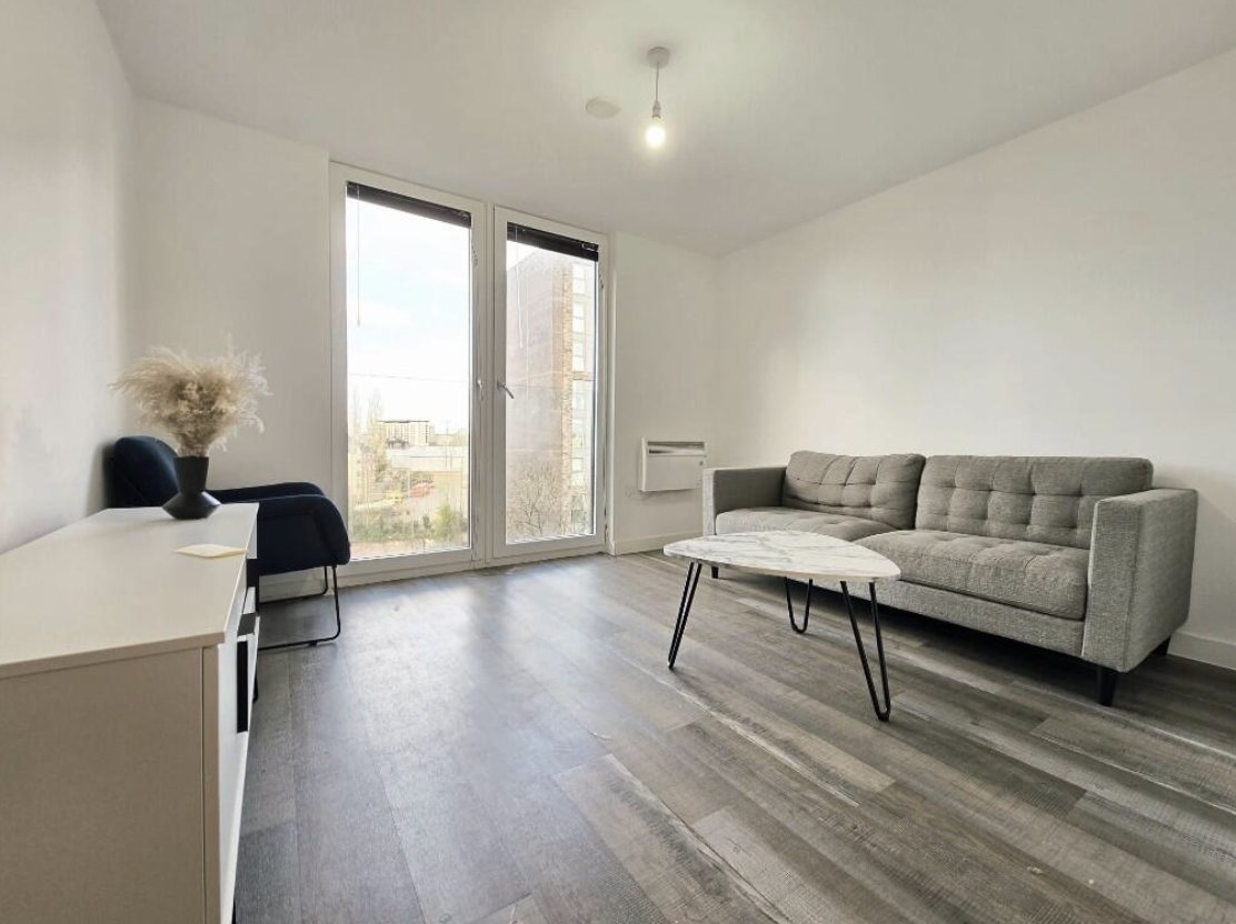 This superb 5th-floor DUPLEX apartment offers contemporary living with impressive open-plan accommodation and far-reaching views across Old Trafford football stadium and towards MediaCityUK. The spacious kitchen and dining area is enhanced by large windows that maximise natural light throughout. The property comprises two well-proportioned double bedrooms, each with ample space for a wardrobe and desk, as well as a centrally located main bathroom featuring a large shower, basin and WC. An additional guest WC is conveniently positioned on the lower level.